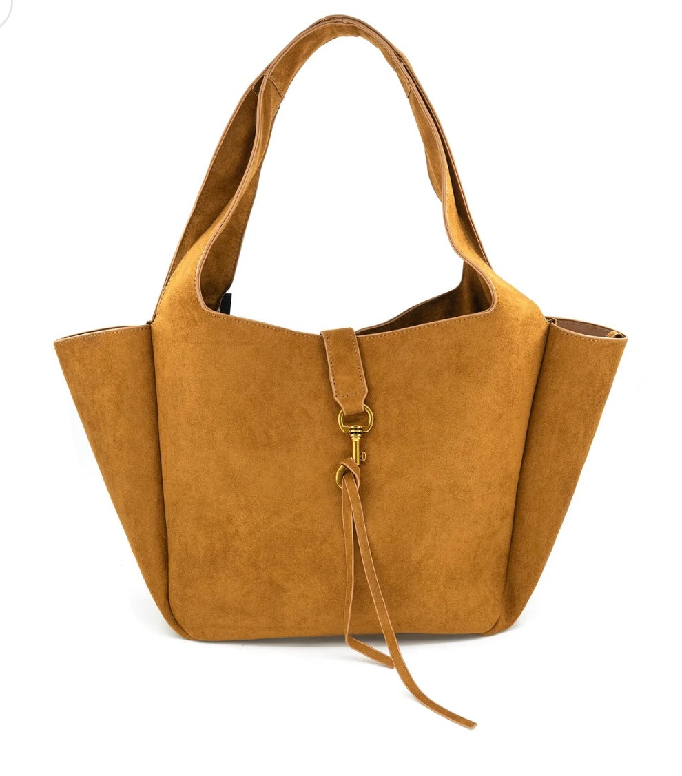 This structured tote is where everyday ease meets elevated style. Crafted in a warm camel suede, it features a softly sculpted silhouette with winged sides for a modern touch. The double top handles make it easy to carry by hand or over the shoulder, while the front strap with a chic gold clasp and tassel detail adds just the right amount of polish. Spacious and practical yet undeniably stylish, this bag is the perfect companion for everything from weekday errands to weekend outings.