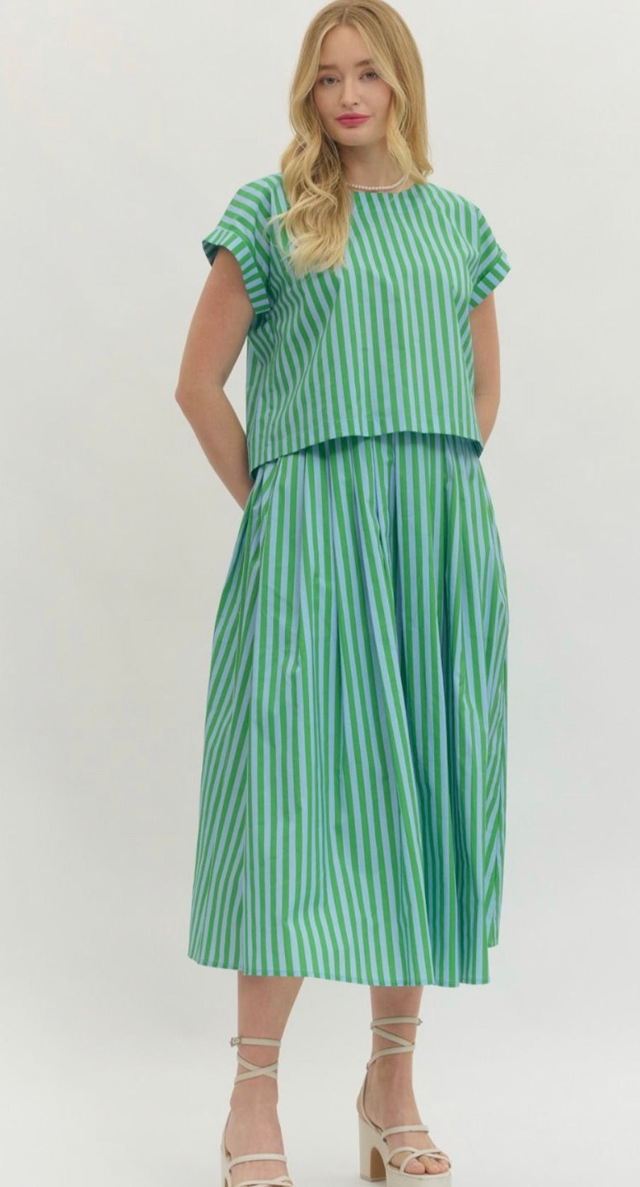 This chic two-piece set features a fresh green and light blue vertical stripe that feels crisp and modern. The top has a relaxed, boxy silhouette with short cuffed sleeves and a clean crew neckline, hitting right at the hip for an easy, polished look. The coordinating midi skirt flows beautifully with soft pleating and a comfortable, flattering fit that moves with you.