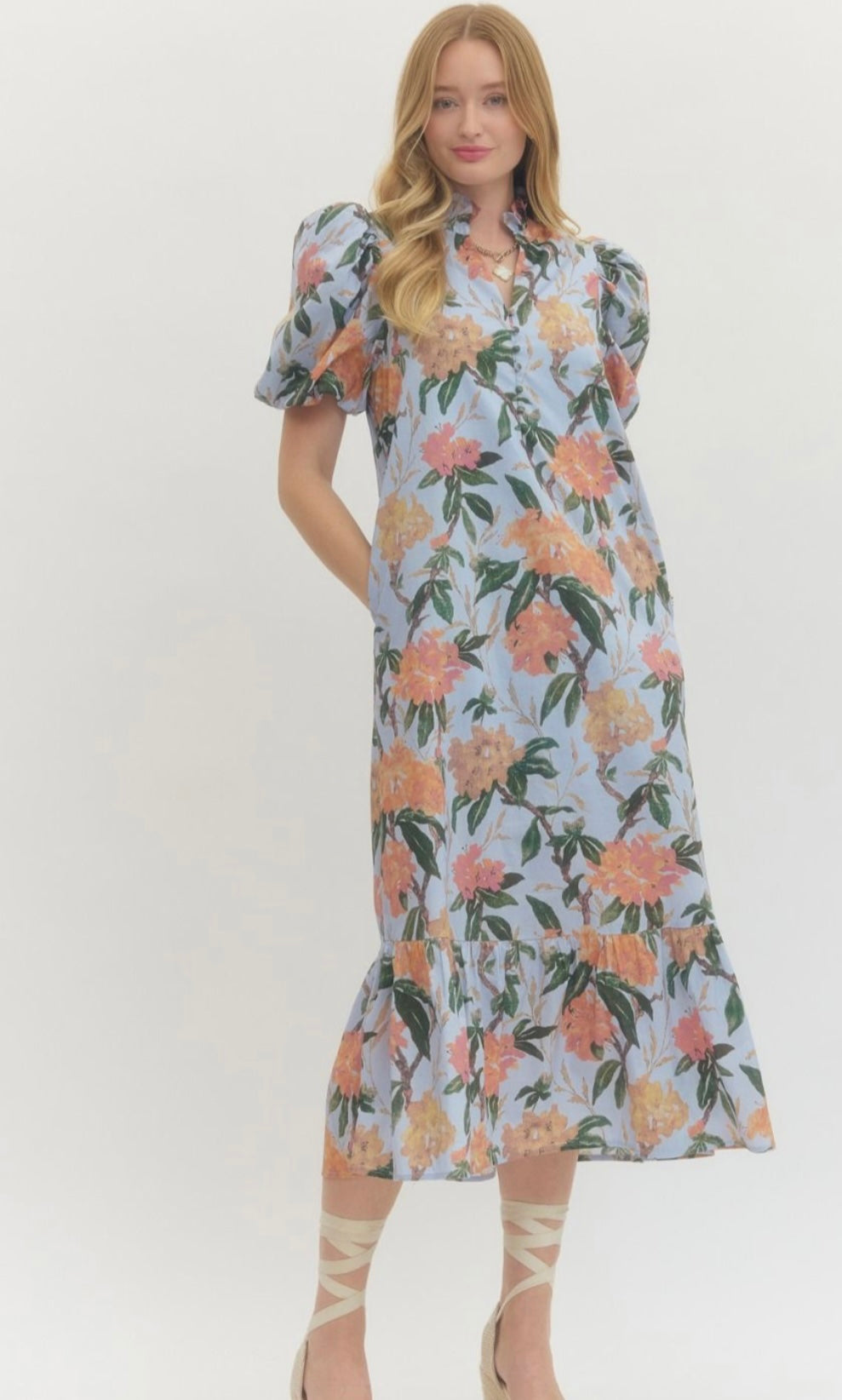 Floral print ruffled neck short puff sleeve midi dress featuring button closure at front. Ruffle hem. Side pockets. Lined. Woven. Non-sheer. Lightweight.