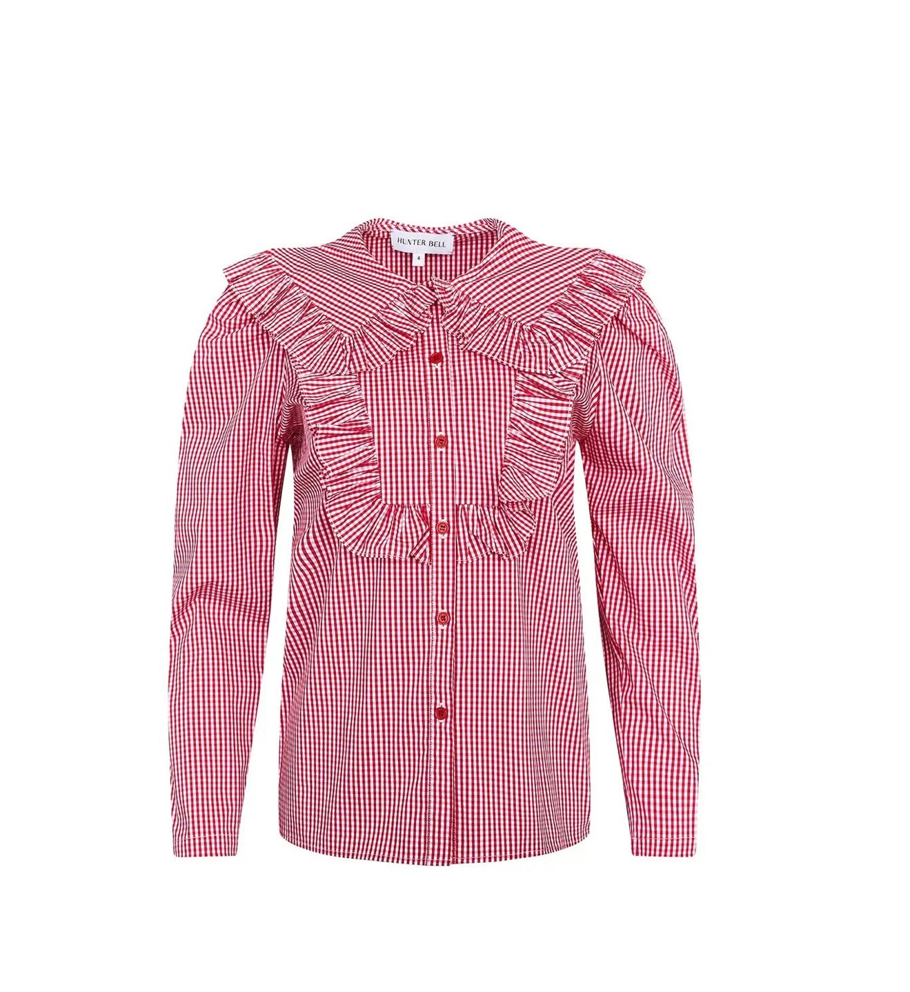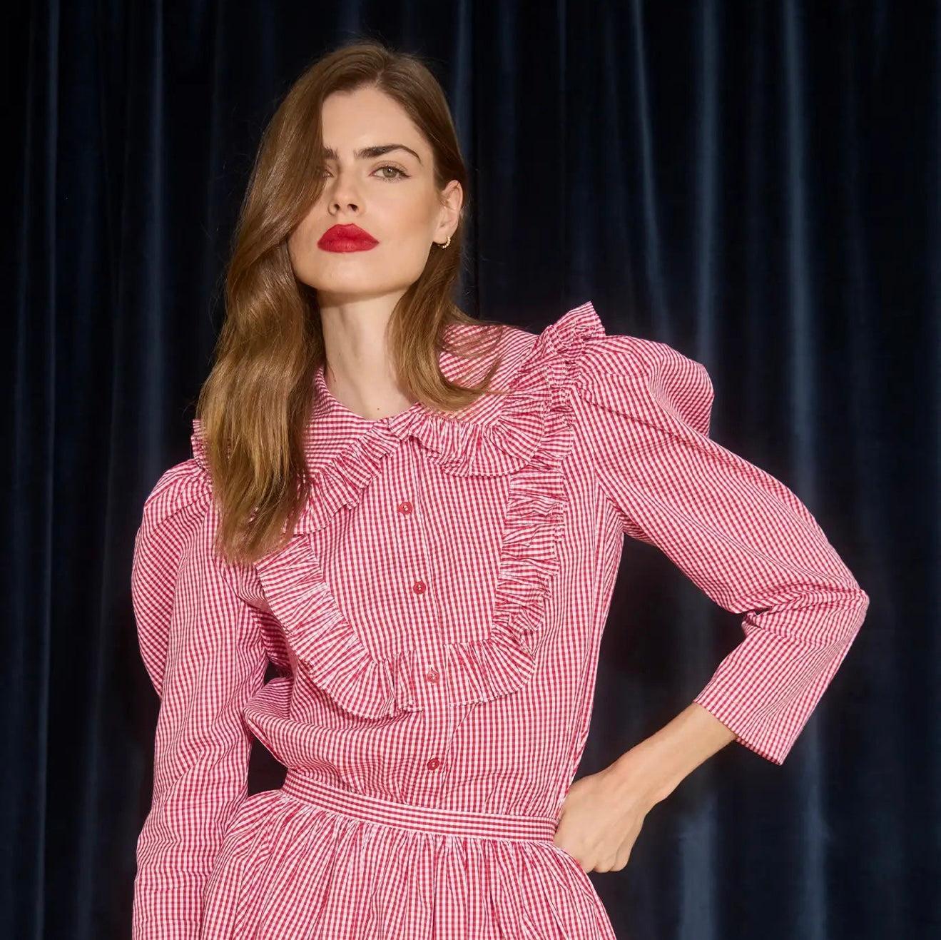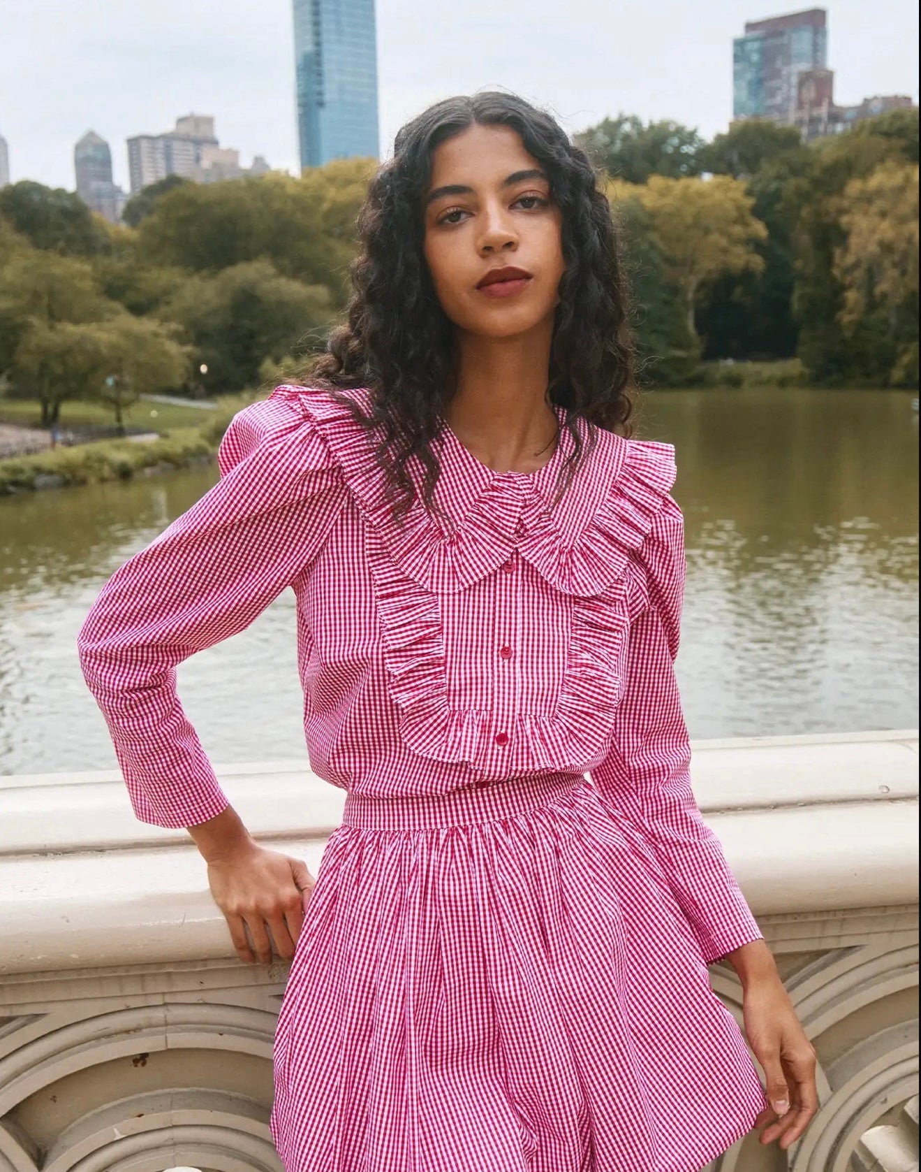 The Mae Top introduces a fresh silhouette to the Hunter Bell collection. Rendered in our Carmine Check, this reimagined gingham top features a collared button front shape, ruffled yokes at both the front and back, and voluminous long sleeves finished with button cuffs. Feminine yet tailored, Mae offers a playful balance of charm and polish.