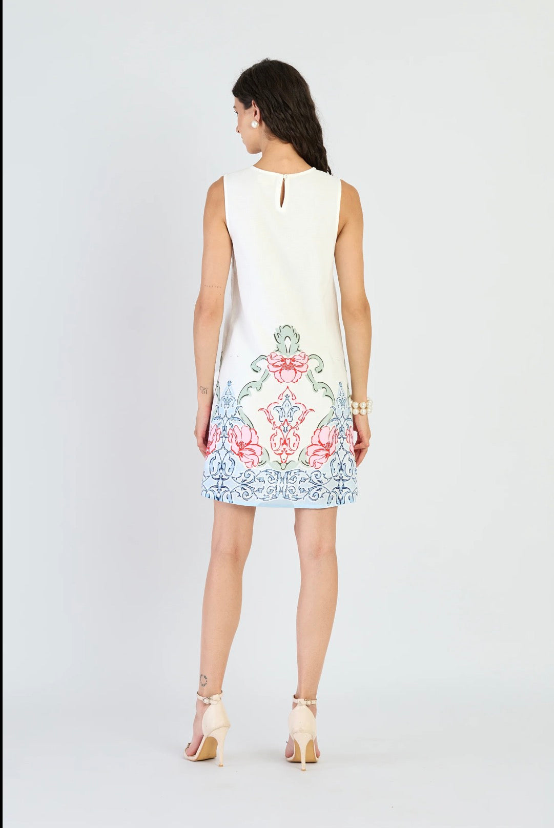 Effortlessly chic, the Frankie reimagines the classic 1960s mini with a modern twist. Its clean shift silhouette and subtle A-line shape flatter the form while keeping things easy and elegant. Frankie is crafted from a unique blend of cotton and linen, offering a soft, breathable feel and a beautifully textured finish. This print is inspired by a vintage photo of a garden luncheon at Palm Beach’s Everglades Club. The image captured chic women in crisp whites and floral dresses framed by manicured greenery.