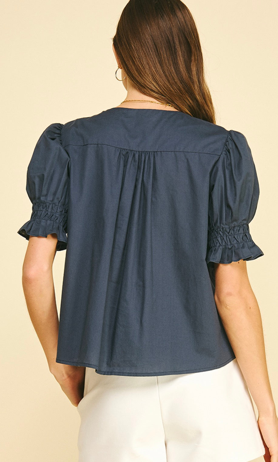 Short puff sleeves bring a hint of volume and are finished with smocked cuffs and a delicate ruffle edge, giving it that preppy, boutique feel. The hemline is slightly flared and hits at the waist, making it easy to wear untucked with shorts, denim, or white pants.