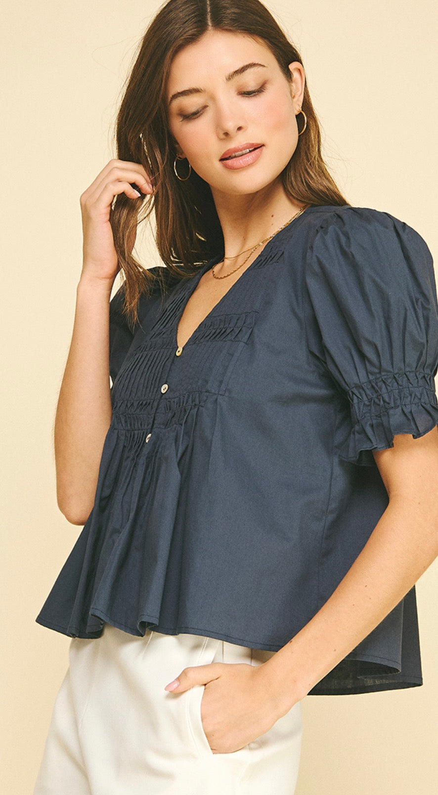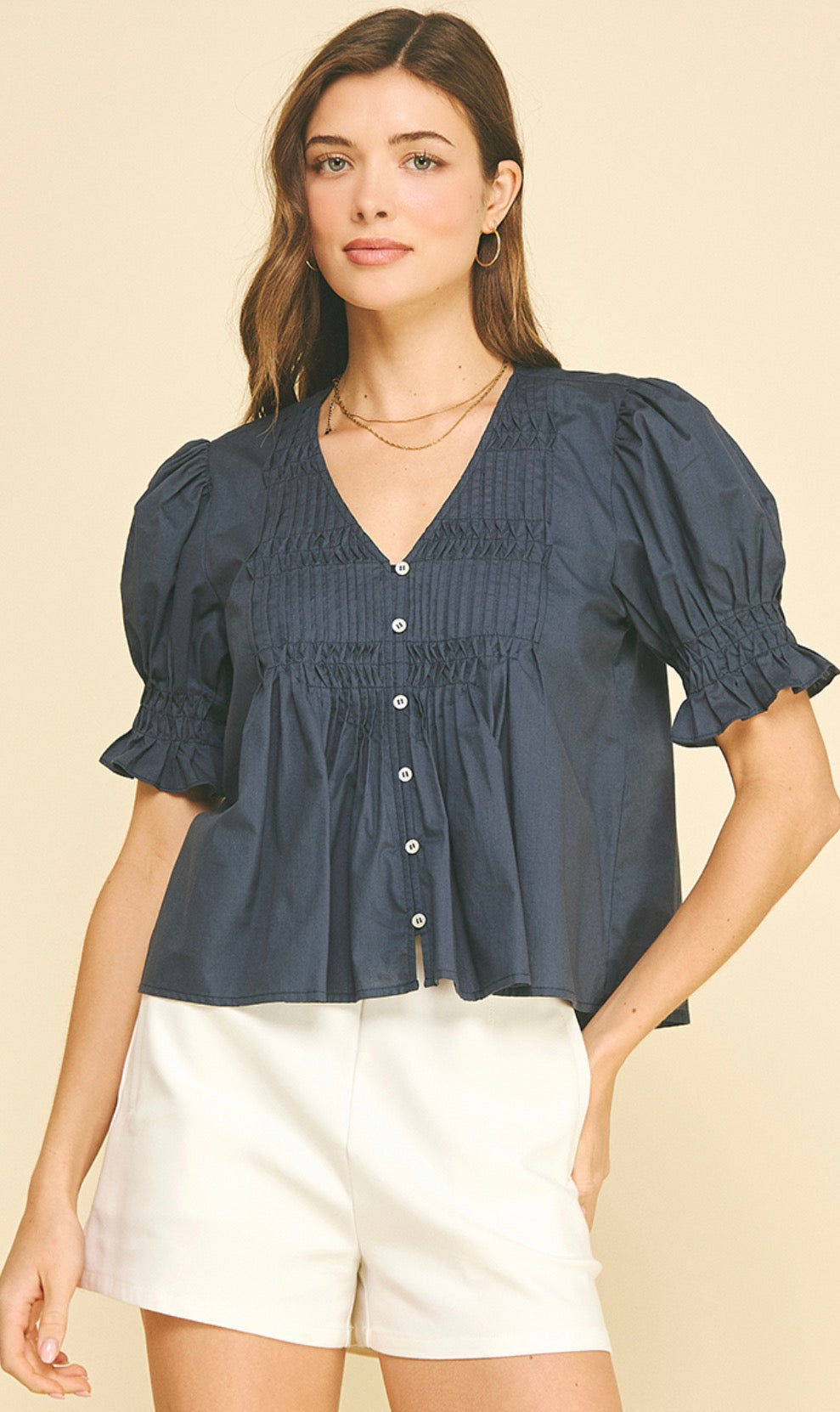 The neckline is a flattering V-neck with a full button-front closure, finished with small light buttons that subtly stand out against the dark fabric. The bodice has beautiful pintuck detailing across the front yoke, adding texture and a tailored touch while still keeping the overall look soft.
