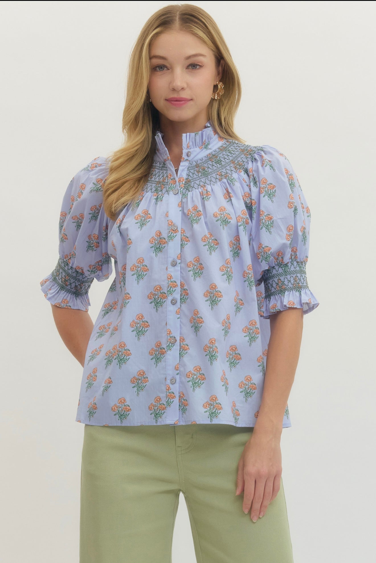 This top has a soft, feminine feel with a polished boutique look. It features a light periwinkle-blue background adorned with a delicate allover floral print in soft peach and green tones. The silhouette is relaxed and slightly flowy, with a button-front design and a subtly flared hem.