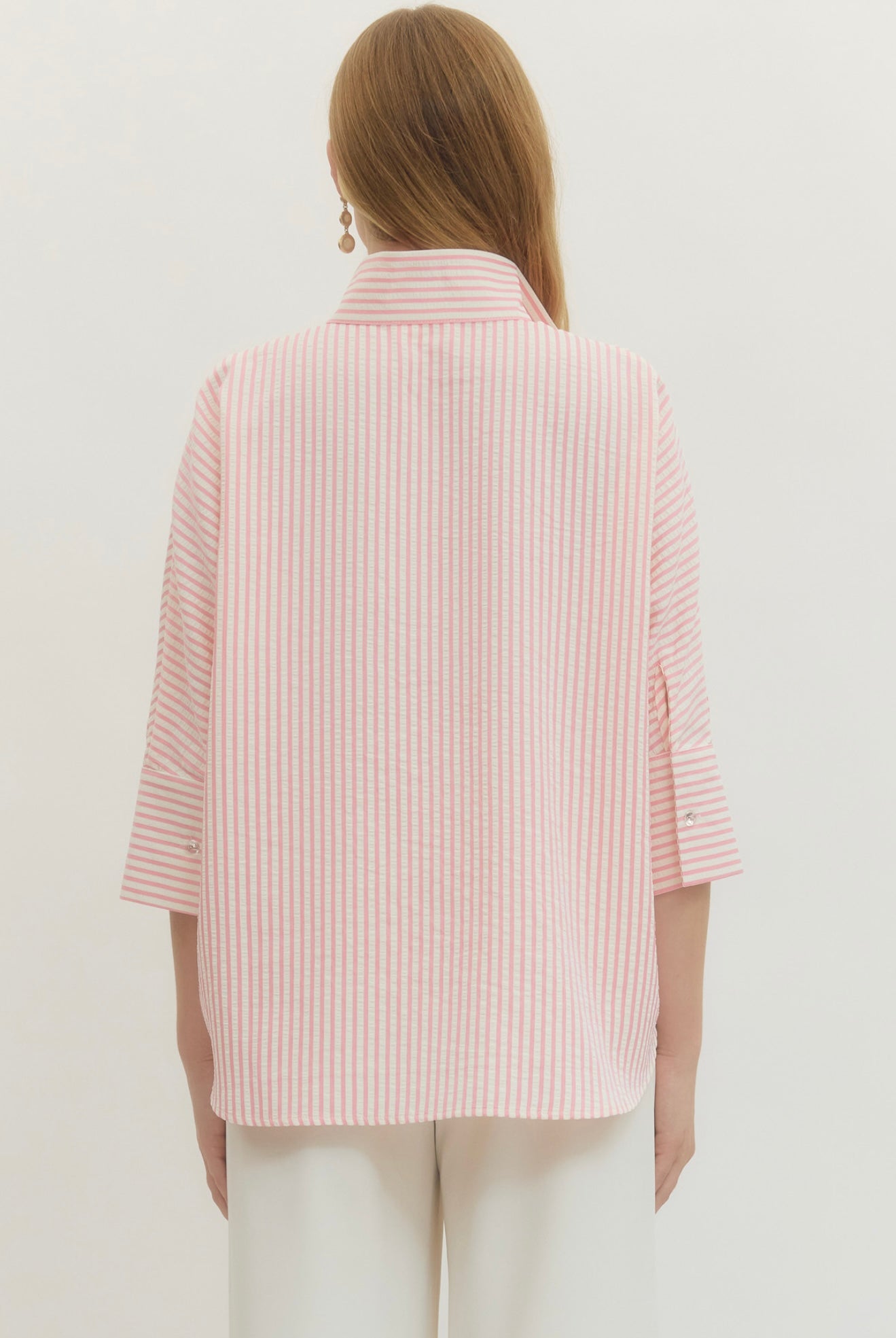 This is a pink-and-white striped blouse with a clean, classic look. It features a stand collar with a split neckline, three-quarter length sleeves, and a relaxed, slightly boxy fit for effortless comfort. The crisp stripe pattern gives it a polished, preppy feel, while the lightweight fabric makes it easy to wear tucked or untucked. Perfect for everyday wear, it pairs beautifully with white pants or denim for a fresh, timeless outfit.