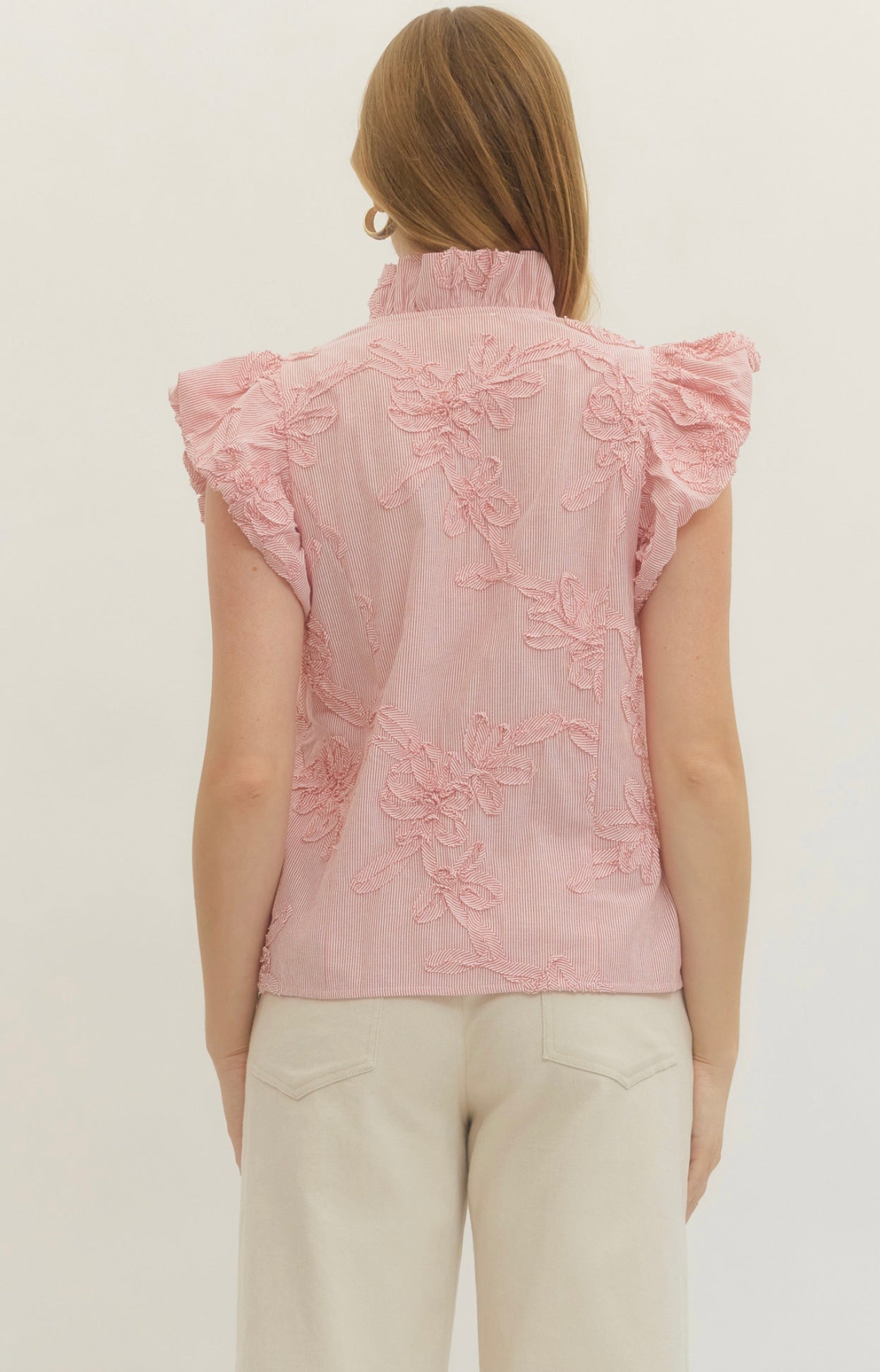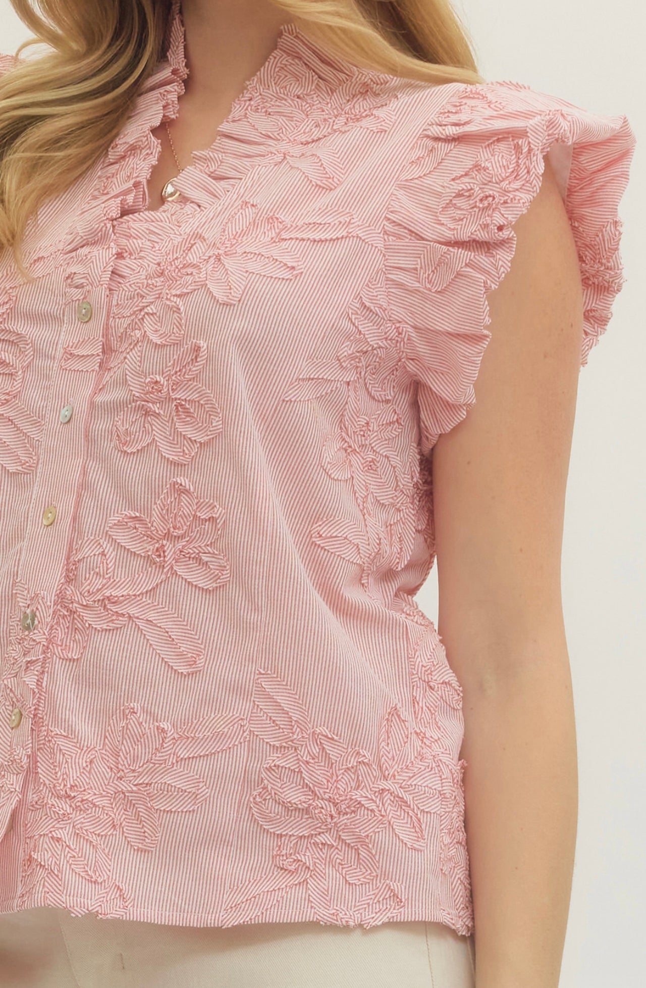 This feminine red-and-white shirt features a delicate pinstripe base layered with textured floral appliqué for a soft, elevated look. The ruffled cap sleeves add a romantic touch, while the collared neckline and button-front design keep it polished and versatile. Lightweight and airy, it drapes beautifully for a flattering fit without feeling fussy.