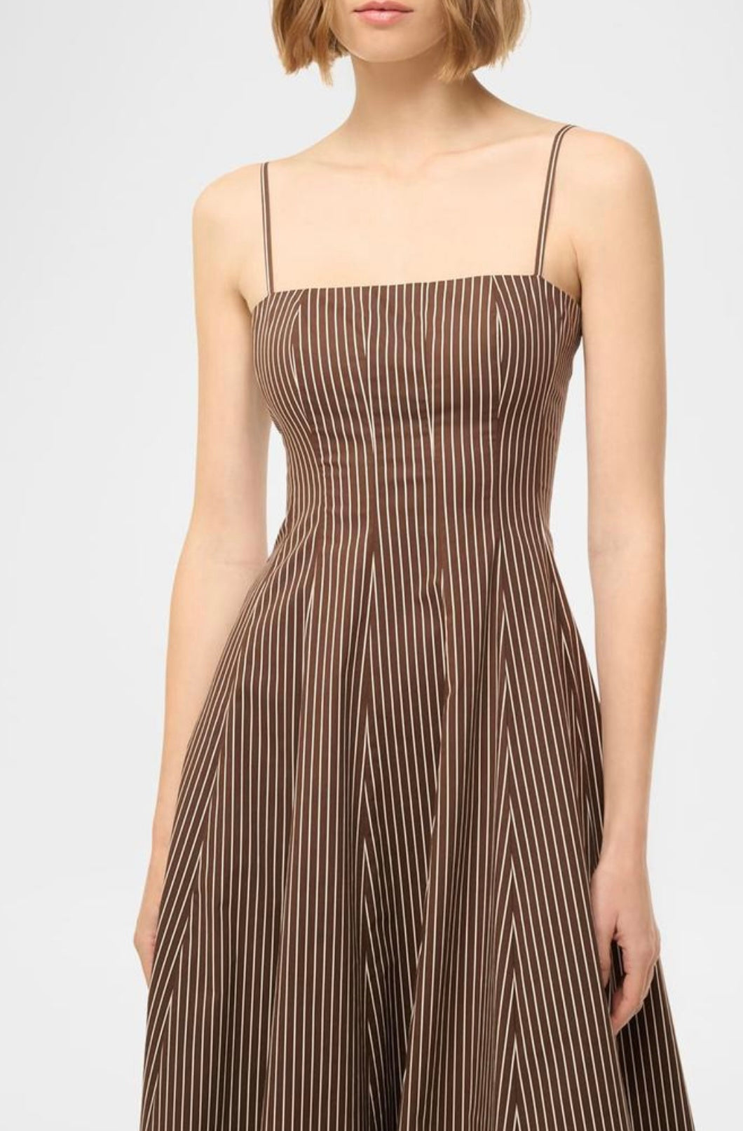 This effortlessly chic midi dress features a timeless vertical stripe pattern in warm brown tones, designed to elongate the silhouette and create a flattering, feminine shape. The fitted bodice is tailored with clean lines and delicate spaghetti straps, giving it a sleek, minimalist look.