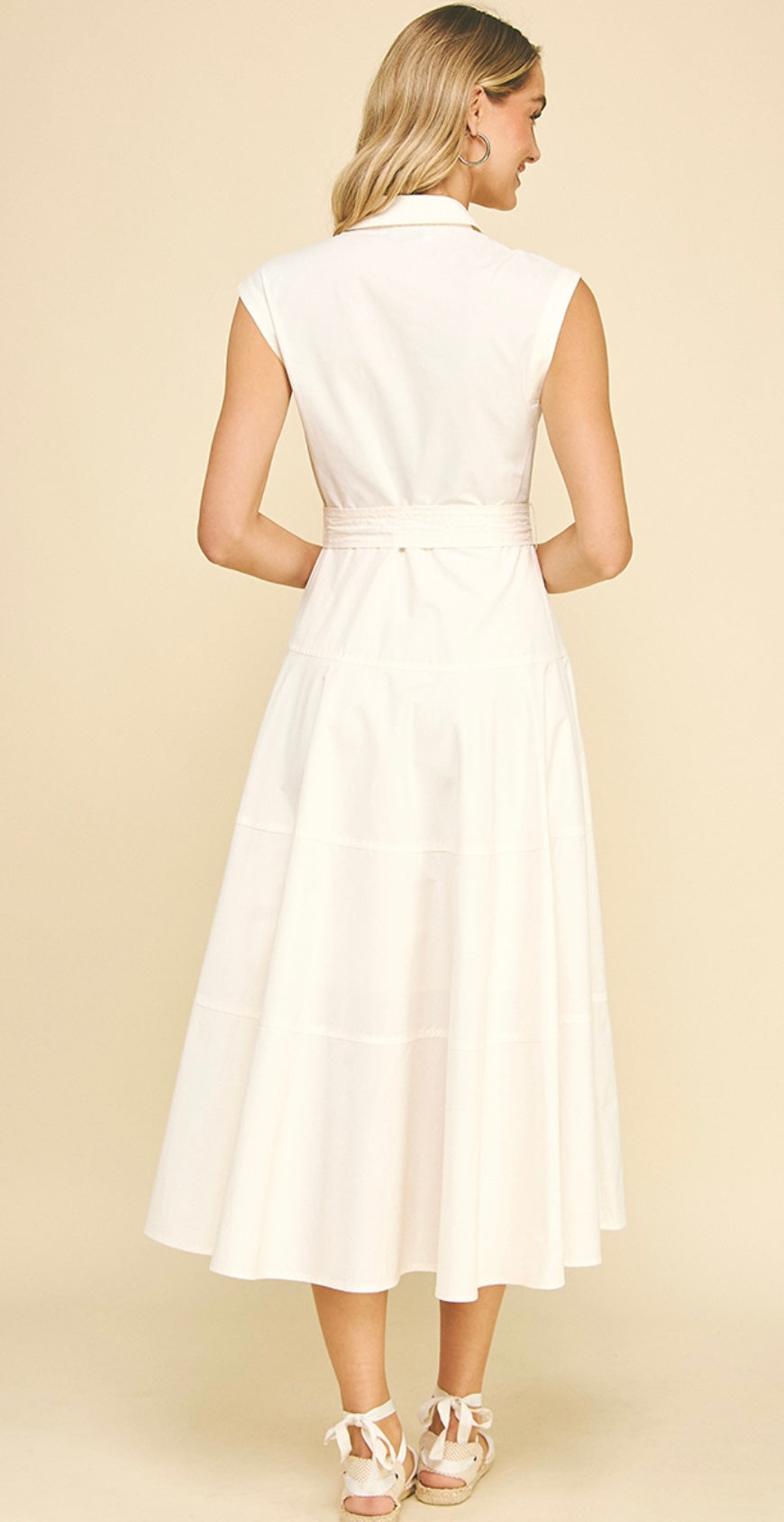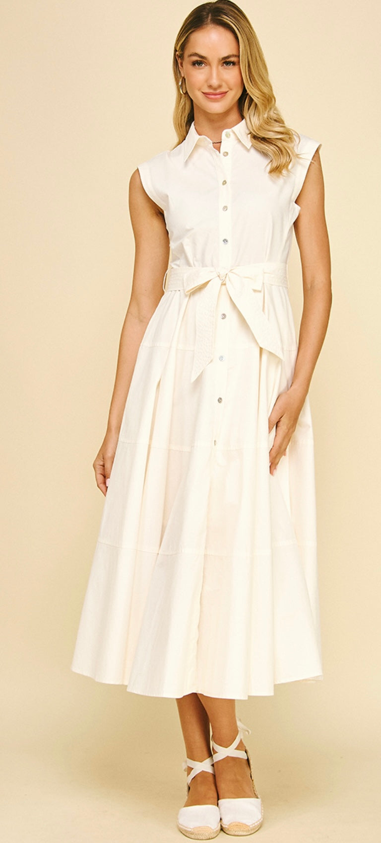 Timeless, graceful, and effortlessly polished—this sleeveless ivory shirt dress is the perfect blend of classic tailoring and feminine charm. The crisp collared neckline and full button-front detail give it a refined, structured look, while the soft, tiered midi skirt adds flowy movement with every step.