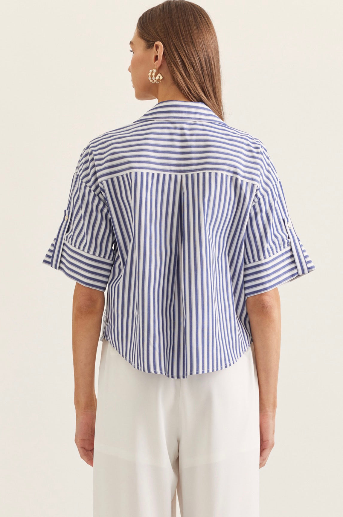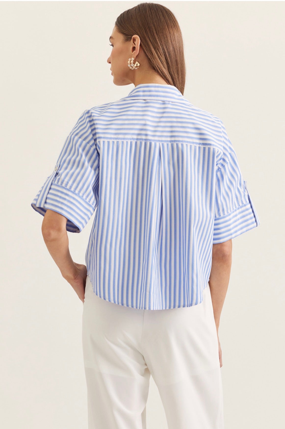 Designed with a structured collar and full button front, it’s elevated by its wide, cuffed short sleeves with subtle tab detailing — a tailored touch that adds interest without feeling fussy. The back features a gentle pleat for added movement and a flattering flow.