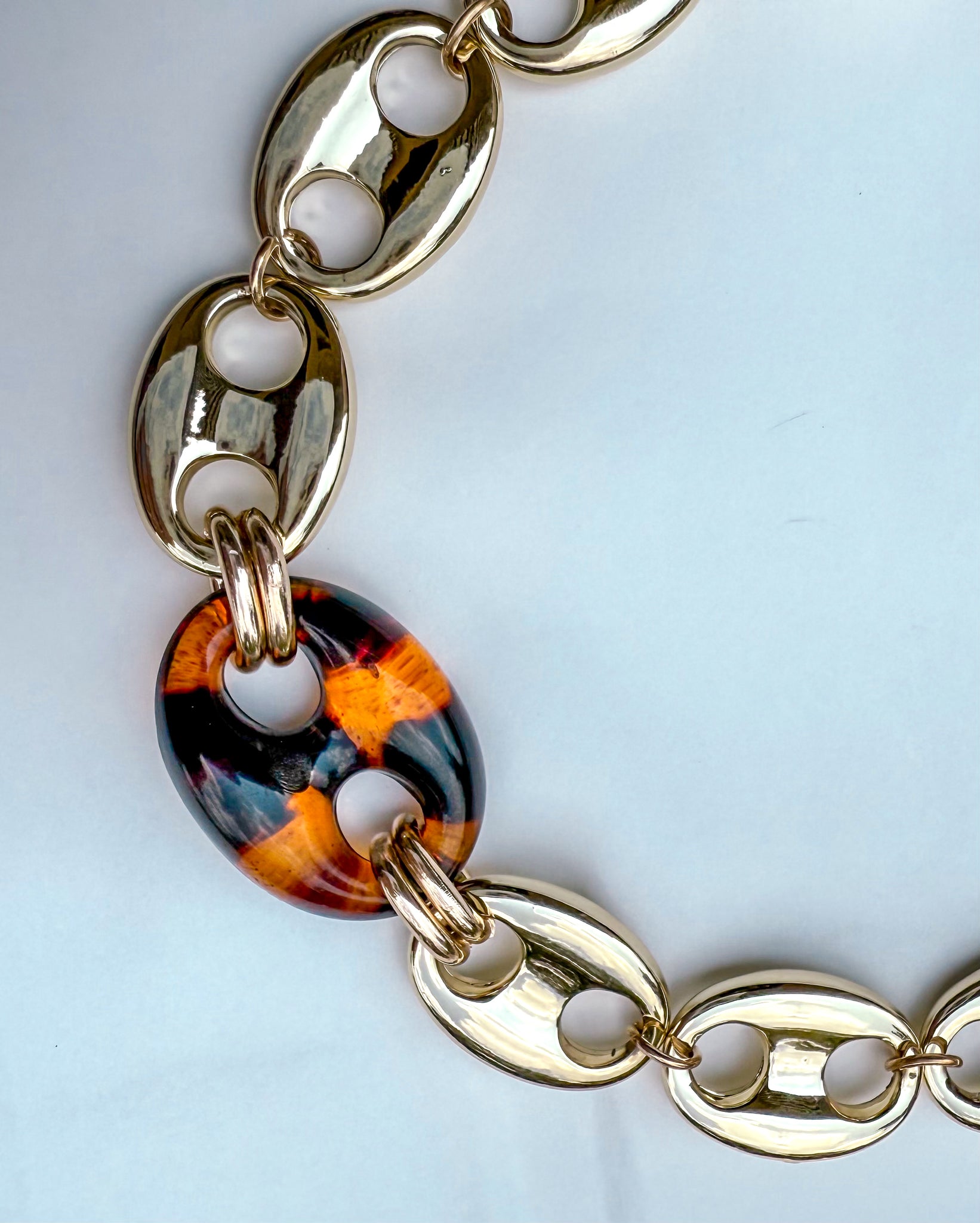Elevate your look with this bold yet timeless statement piece. Oversized, high-shine gold links create a polished chain that feels both classic and modern, while a tortoiseshell-style resin ring anchors the design with rich coastal charm. Finished with an adjustable clasp for the perfect fit, this necklace transitions seamlessly from daytime chic to evening sophistication.